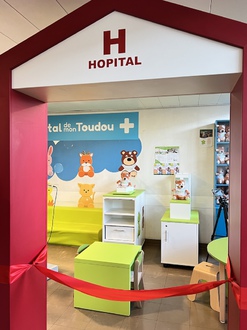 L’Hôpital de mon Toudou se trouve au 12° étage dans la salle d’attente de chirurgie pédiatrique du bâtiment réservé aux enfants et dans ce mini hôpital joyeux et coloré, le petit malade hospitalisé découvre des appareils médicaux emblématiques et peut ainsi faire passer un IRM ou une séance de radiothérapie avec le LINAC à son nouveau petit compagnon, lui faire des piqures, lui mettre des pansements et lui prodiguer tous les soins qui sont nécessaires à sa guérison. Cet adorable nounours permet au petit malade d’opérer un transfert psychologique de l’anxiété bien légitime qu’il éprouve, lors de son hospitalisation. Toudou est aussi son compagnon privilégié lorsqu’il a besoin de douceur, de chaleur ou de câlins.